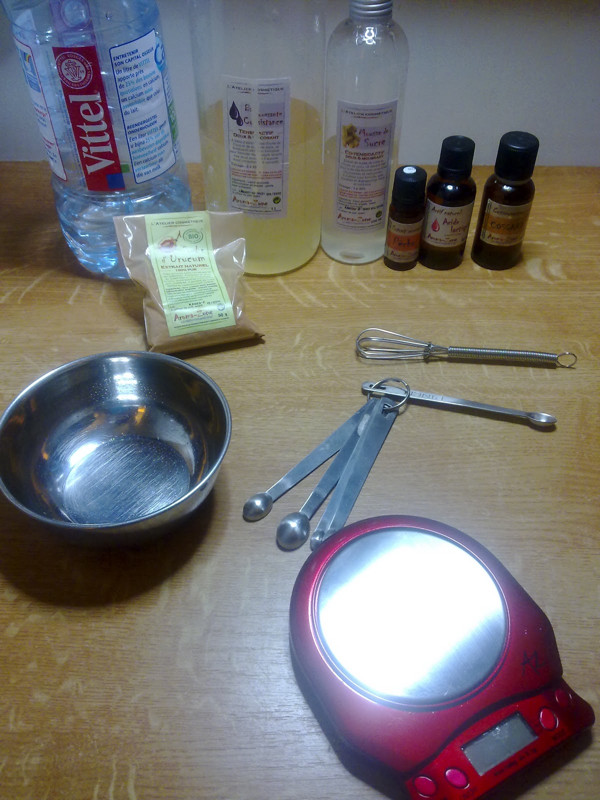 2/ Préparation de ma phase tensioactifs : je transvase une à une les quantités de tensioactifs dont j'ai besoin puis j'agite bien (photo prise avant agitation)