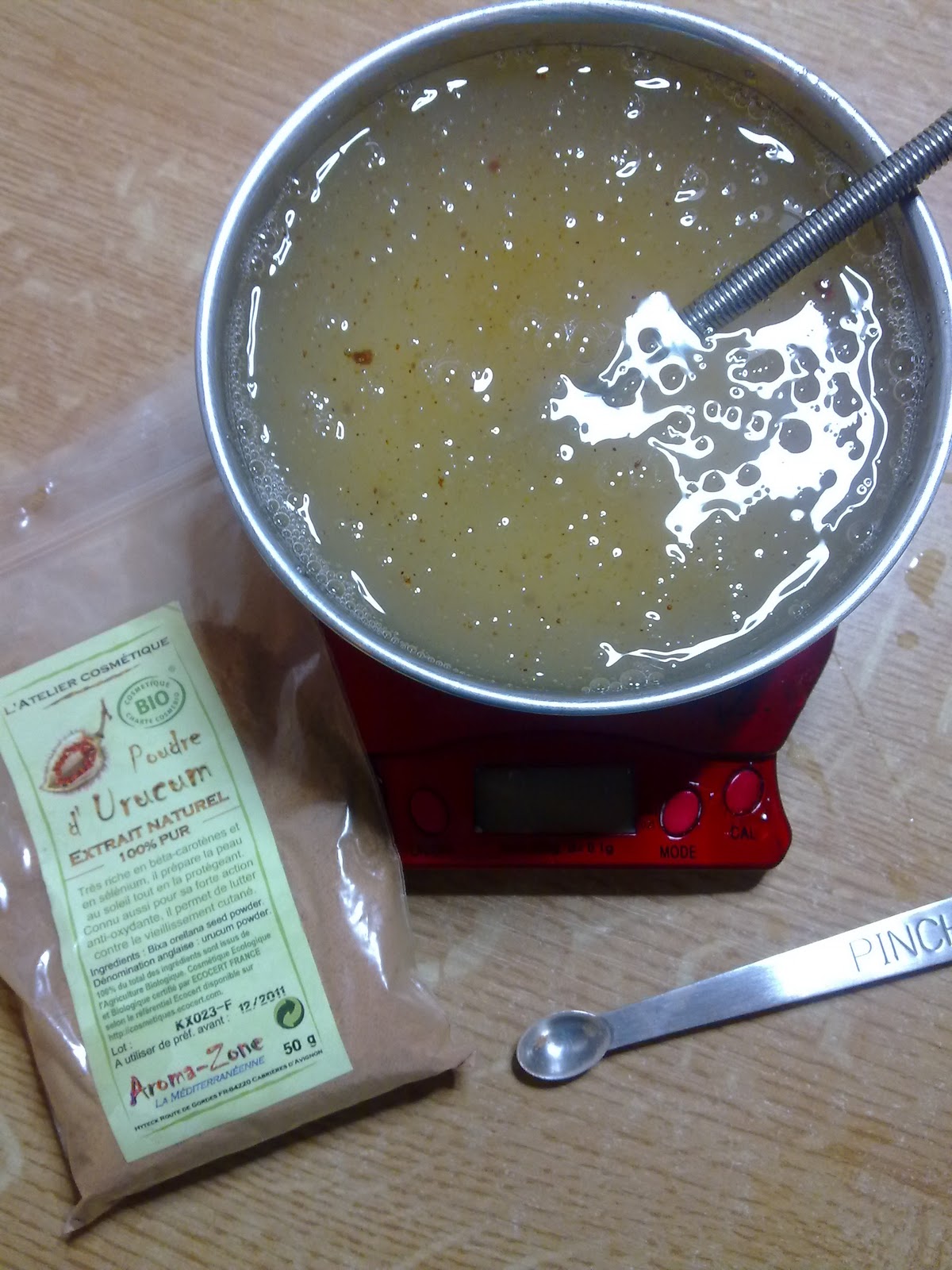 - 1% soit 2.5g d'Acide lactique (correcteur d'acidité)-1.6% soit 1 cuillère PINCH de Poudre d'Urucum (pour la couleur)