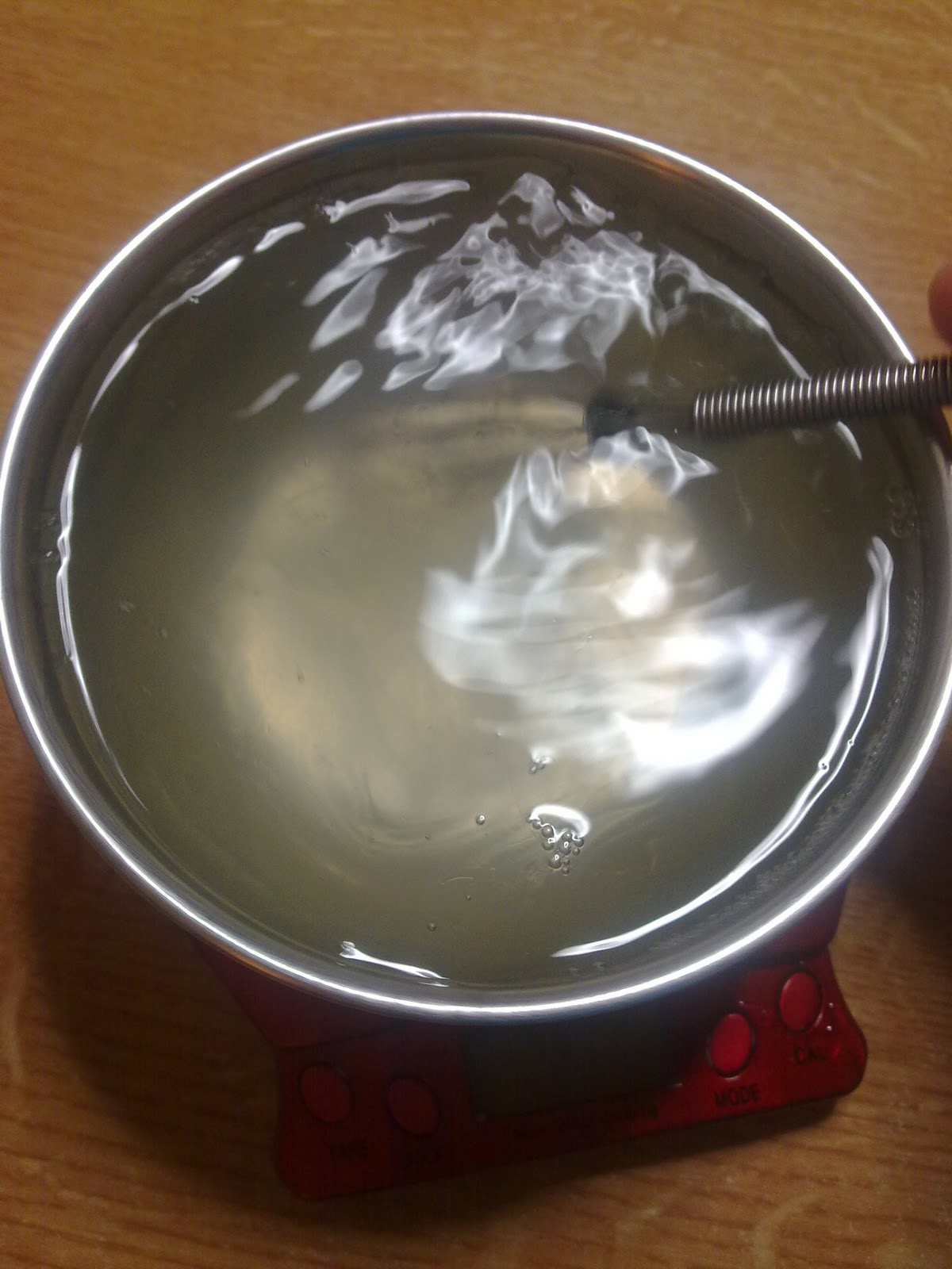 4/ Puis je mélange. Pour homogénéiser l'ensemble, agiter délicatement. D'abord vous avez l'impression que le mini-fouet est lourd quand rien n'est mélangé. Je procède comme on fait une mousse au chocolat : je passe le mélange de tensioactifs au-dessus de l'eau pour l'incorporer. Petit à petit, le mélange de tensioactifs se désépaissit vu qu'il se mélange à l'eau. A la fin, en mélangeant au mini-fouet, celui-ci paraît tout léger : c'est bien mélangé ! Autre indice : le mélange devient tout opaque.