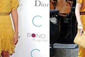 Robe pull marron à manches courtes (29,95 €), leggings couleur jaune moutarde (12,95 €), large ceinture marron (14,95 €), bottes marron à talons hauts (59,95 €).