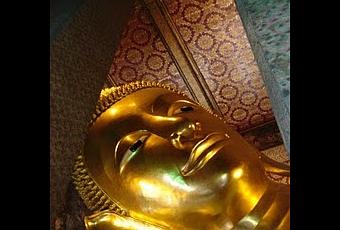 En Thaïlande, on commence peut être toujours par le tour des bouddhas.Nous ça a commencé par le Wat Pho où se trouve ce bouddha couché géant recouvert de feuilles d'or et enfermé dans un temple bien trop petit pour l'accueillir.