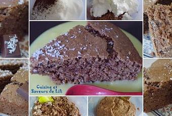 Dans le cul de poule, mettre la farine, la noix de coco, la levure et le sucre. Ajouter le café soluble, l'huile, le yaourt la faisselle, la vanille liquide et le chocolat fondu et battre le tout.