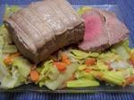Verser tous les légumes, l’estragon, l’oignon et la branche de persil dans l’eau bouillante. Ajouter le gros sel et quelques tours de moulin à poivre. Laisser bouillir 5min. puis y plonger la viande retenue par la ficelle à la poignée de la casserole. Cuire 25min. en écumant si nécessaire. En fin de cuisson, retirer la viande à l’aide de la ficelle. La tenir au chaud. Egoutter les légumes en gardant le jus de cuisson. Servir la viande entourée des légumes sur un plat de service.