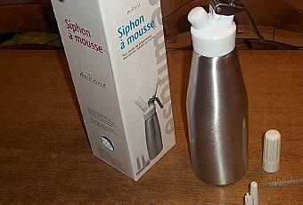 On m'en avait prêter un pour que je l'essaie et franchement , après ma recette de mousse au chocolat et la crème chantilly , ça y est le siphon est adopté pour la cuisine !!!