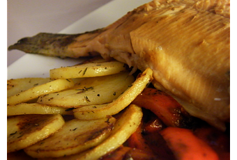 Faire revenir dans une poêle (celle des pommes de terre peu aussi resservir), avec le restant d’huile, les truites à feu doux, 10 minutes de chaque côté.