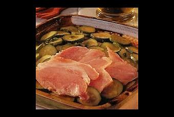 - Égoutter le jarret ; ôter sa couenne et couper le en tranches. Les poser sur les courgettes.