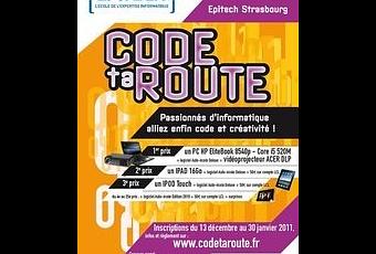 EPITECH Strasbourg, l’Ecole supérieure d’informatique lance "Code ta route" un concours de programmation ouvert aux lycéns.Le Concours « Code ta Route » a comme objectif de sensibiliser les lycéens aux problématiques de sécurité routière de façon ludique, grâce à la réalisation d’un jeu vidéo.Epitech propose un sujet de projet qui peut être travaillé seul ou en groupe,par exemple dans le cadre des clubs informatiques des lycées. Le but du concours est de réaliser un programme informatique répondant au mieux au sujet de l’épreuve, qui sera dévoilé le 31 janvier 2011. La qualité du code produit est un des critères les plus importants ! Tous les langages (C/C++, Java, .NET, Python, Perl, PHP, Ruby, objective-C …), et toutes les plateformes communicantes (PC, Windows, Linux, Mac, Symbian, calculatrices) sont acceptés. Un jury de professionnels départagera les soumissions des lycéens.