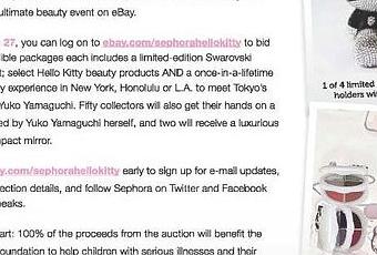 Du 17 au 27 Janvier  , des articles de la collaboration Sephora x Hello Kitty seront mis aux enchères sur Ebay.com afin de récolté de l'argent pour la  Starlight' Children's Foundation qui aide des enfants gravement malades et leurs familles . Seront notamment mis aux enchères quatre sets de pinceaux ornés de cristaux Swarovski (voir première image ci-dessous) qui inclut une rencontre avec Yuko Yamaguchi à New York , Honolulu ou Los Angeles !
