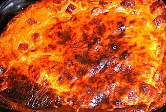 Verser cette préparation dans un moule à gratin beurré et tapissé de chapelure (j'ai oublié la chapelure, tiens ! Oups !!) puis ajouter les saucisses coupées en morceaux.