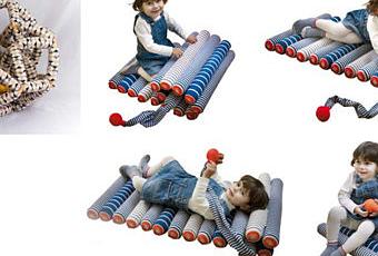 Voici le résultat de la collaboration entre Mathilde Brétillot, designer, et l'entreprise Collégien: une ligne de mobilier ludiques et colorés pour enfants. Cette collaboration a lieu dans le cadre du projet Tech&Design, organisé par R3iLab pour le salon Maison&Objet (du 21 au 25 janvier 2011). Collégien fabriquant des chaussettes, des bas et des collants, Mathilde Brétillot choisit d'exploiter les qualités de l'entreprise en maille tubulaire pour réaliser une ligne de mobiliers modulables. Il s'agit en fait de cylindres en maille (ou de chaussettes géantes!) rembourrés de tubes en mousse. Le résultat final, multicolore, donne l'impression que ce sont les enfants eux même qui ont créé leur cabane en jouant avec leurs chaussettes et leurs collants! Personnellement cela me donne envie de faire comme cette petite fille, de me rouler parterre, voire même de m'en fabriquer un!