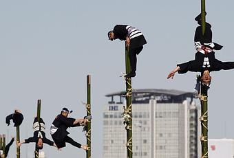 se livrent à de véritables voltiges sur des échelles en bambous. (Yuriko Nakao/REUTERS)