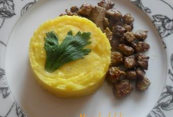 Sel, poivre 300 g de steak de boeuf tendre1 demi cuillère à café sel, poivre, cumin, paprikas,2 cuillère à soupe d'huile d'olive Cuire les pommes de terre à l'eau bouillante salée, les éplucher Passez au presse-purée , ajoutez la crème fraîche, le sel, poivre , le beurre le lait et le fromageCuire à feu doux en les mélangeant au fouet, jusqu'à avoir une purée bien lisse. Couper en petit morceaux les steaks, le mariner avec les épices, bien mélanger les faire revenir dans de l'huile d'olive