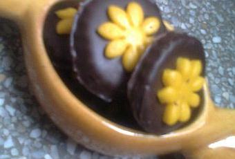 - Biscuits sablés enrobés dans du chocolat noir et décorés de fleur en pâte d’amande colorée en jaune.
