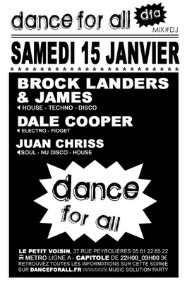 Ce samedi marque la rentrée des soirées Dfa (Dance For All), qui font la part belle aux musiques urbaines, de la soul ou la disco à la ghetto-bass en passant par la house la plus groovy. No stress à l'entrée, pas de sélection : seul compte l'amour pour les musiques underground. Ça se passe au PV, le Petit Voisin, à Toulouse (37 rue Peyrolières) ; on entre, on se dirige vers le fond, on s'acquitte du modique passe de 3€ pour descendre à la cave et... c'est parti : house is back!Au programme de cette édition :