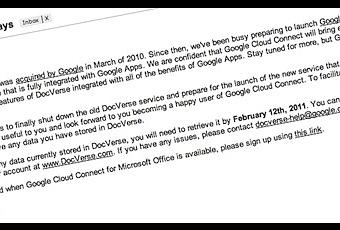 Il semble que Google Cloud Connect apparaîtra bientôt sur Google Apps. C’est du moins ce que nous pouvons comprendre d’un mail que Google a fait parvenir à ceux qui possèdent un compte chez DocVerse. Dans trente jours, ce service fermera pour faire place à Cloud Connect.