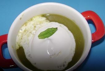 4) Verser le velouté dans les cassolettes, donner un coup de siphon par dessus et décorer d'une petite feuille de menthe