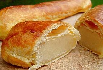 2. Couper les rectangles de pâte en deux dans le sens de la longueur. Disposer les boudins de pâte d’amande au centre et enrouler serré la pâte autour de la pâte d’amande. Fermer et sceller les extrémités. Placer sur une plaque recouverte de papier cuisson.