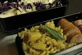 Alors dans ce bento il y a dans le premier compartiment une salade de chou chinois, de chou rouge et d'endive. Dans le second compartiment il y a une demi saucisse de veau et mon sublime risotto au coing et à la pomme.