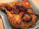 Sortir le poulet, déglacer avec un peu de cidre, ajouter les tomates entières peleés et le cidre. Remettre les cuisses de poulet. Rajouter du poivre, saler, mettre une pointe de piment, le laurier, couvrir et laisser mijoter 1 heure environ.