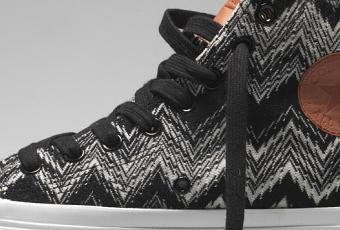 Le résultat est surprenant et magnifique : la converse est tissée de noir et blanc et rehaussée par des applications en cuir de mouton lavé couleur "Rouge Brique Missoni".