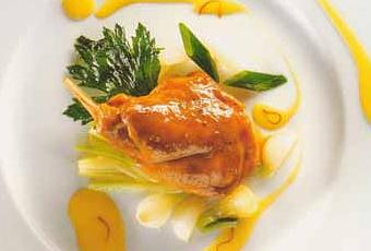 Marché pour 4 personnes : 4 cuisses de lapin macérées à la coriandre fraîche, 150 g de salsifis nettoyés et coupés en bâtonnets, 100 g d’oignons coupés en quartiers, 100 g de céleris dorés, nettoyés et coupés en julienne, 3 g de pistils de safran, 50 cl de fond de veau, beurre.