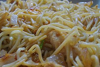 125 g de nouilles aux oeufs chinoises, 1 cm de gingembre frais, 1 gousse d'ail, 1/2 oignon, 2 petits filets de poulet, 1 cs d'huile neutre, 1 poignée de pousse de soja, 1 cc d'huile de sésame, poivre du moulin.