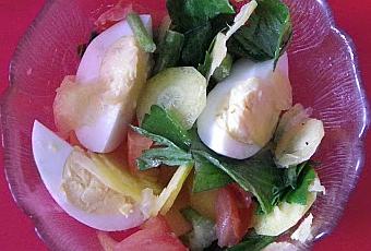 On ajoute une demi-tomate coupée en cubes, un œuf dur en tranches et une carotte jaune en rondelles.