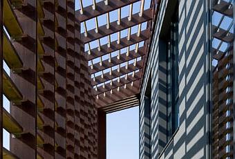 Quelle métamorphose depuis les années 70 ! En effet, depuis le printemps 2009, la Médiathèque apporte une perspective de modernité dans un environnement urbain contrasté. Le projet utilise la déclivité du terrain pour s’organiser en différents paliers intérieurs. A l’extérieur, la médiathèque apparaît aux riverains et visiteurs comme une halle monolithique cuivrée (teinte donnée par l’habillage extérieur du bâtiment).