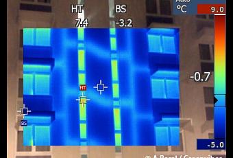 Cette faculté fait de la thermographie un outil idéal au service du bâtiment. Un mur mal isolé, un défaut d'étanchéité, des problèmes dans le réseau électrique, une fuite, de l'humidité... sont autant de facteurs qui vont entraîner localement un différentiel de température qui va pouvoir être mis en lumière par la caméra. Ainsi, sur la photo ci-dessus d'une façade, on voit nettement la forme des escaliers, indiquant la présence de ponts thermiques à cet endroit (la chaleur fuit par l'escalier accolé à la façade, d'où une température plus élevée apparaissant en bleu clair).