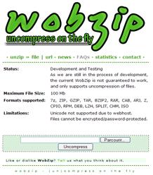 Wobzip est un site qui vous rendra bien service dans le cas cas où vous recevez une archive pour laquelle vous ne possédez pas le logiciel adéquat. Il est en effet frustrant de devoir rechercher un logiciel puis de l'installer pour au final découvrir qu'il n'est pas gratuit ou qu'il ne répond pas à vos attentes. Wobzip vous propose donc de décompresser la plupart des archives connues si celles-ci font moins de 100 mo. Il suffit de parcourir votre disque à la recherche du fichier et de cliquer sur "Uncompress". wobzip.filetap.com