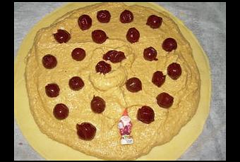 Dérouler la pâte feuilletée sur une plaque allant au four. Etaler la crème à la pistache sur le premier en s'arrêtant à 3cm du bord. Répartir les cerises et mettre la féve sur un côté.