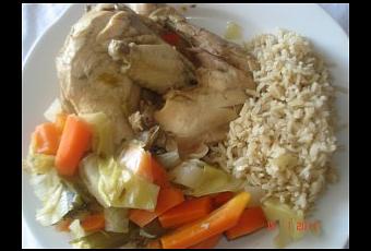 Découper la poule, la servir avec les légumes, napper de sauce blanche. Accompagner du riz pour celles en conso uniquement.