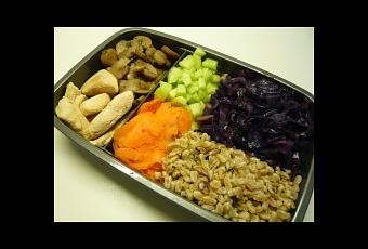 Ce lundi, me voilà en route avec un bento pour lequel je n'ai pas vraiment cuisiné. Un bento pas du tout japonais. J'ai un peu improvisé avec les ressources que j'avais en stock et avec l'idée que ce soit varié et parfumé. Cela a donné : du poulet vanillé, des carottes à l'orange et au cumin, des dés de concombre, du chou rouge aux marrons, des champignons à la coriandre, de l'épeautre. Le tout a été fort agréable à manger, il y avait une grande diversité de parfums et de textures. Et la variété, pour moi, fait partie du plaisir d'un repas : je suis plus heureuse avec une multitude de saveurs qu'avec un plat copieux.