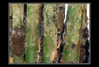 La pointe du Cap Ferret est une balade à faire à marée basse, si possible avec un fort coefficient pour que l’eau parte loin, loin, loin … Pas trop loin quand même, ce n’est pas la baie du Mont-Saint-Michel. Mais c’est l’occasion de marcher sur ce sable trop souvent recouvert par l’eau, et donc de voir ce qui est généralement caché. Par exemple ces bouchots de hasard que sont devenus les pieux censés retenir la plage. Il n’ont pas retenu le sable, mais les moules s’y trouvent à leur aise :