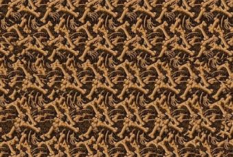 J'ai toujours adoré les stéréogrammes, certainement parce que j'arrive à les voir. Si vous approchez le nez de votre écran et louchez, votre vue devrait se brouiller et vous devriez voir apparaître un dinosaure au milieu des os sur l'image suivante que j'ai créée avec Stereogram Explorer. Reculez votre tête de l'écran tout en maintenant le "focus". Vous pouvez cliquer sur l'image pour l'agrandir un peu.