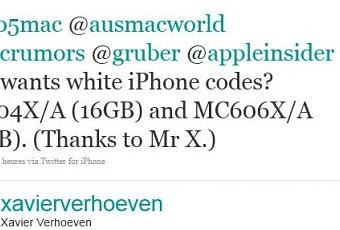Un ancien rédacteur de Macworld Australie, Xavier Verhoeven, a publié sur son compte Twitter il y a quelques heures, les codes correspondant aux références des supposés iPhone 4 Blancs : MC604X/A (16 Go) et MC606X/A (32 Go).