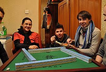 L’université ne nous autorisant pas à jouer au Mah-jong dans le cadre de notre association d’échanges culturels, nous avons pris l’habitude de jouer dans des maisons de thé, ou à la maison. Ci-après deux photos prises chez Laurent, il y a quelques semaines :