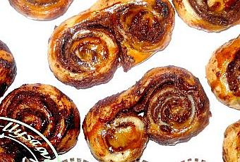 j'ai étalé ma pâte feuilletée en un grand rectangle, j'ai badigeonné dessus du nutella, j'ai roulé d'abord d'un coté, puis de l'autre, puis j'ai couoé des petits tronçons, j'ai badigeonné dessus de jaune d'oeuf et hop au four préchauffé à 180 degrés, cuisson environ 20 mn à surveiller et c'est tout, un petit délice à déguster avec un p'tit café un un thé ou alors un bon chocolat chaud