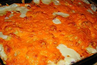 Beurrer le moule à gratin et verser le contenu du saladier dans le plat. Eparpiller le fromage râpé sur toute la surface du gratin.