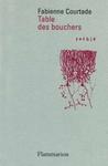 « Poursuivant l’avancée de Il reste, Fabienne Courtade précise dans cette Table des bouchers son singulier projet (entre autres), qui consiste à réintroduire la narration dans le poème – ou plus exactement à la redéfinir, jouant de ses gros plans comme de ses lacunes pour aboutir à ce troublant récit en vers. Une histoire se déroule en effet – lente, précise, rituelle – un peu comme dans un roman noir, juxtaposant incises réalistes et notations mentales. Une femme évoque un homme, disparu ou absent, égrenant le temps suspendu d’une attente que rien ne vient combler : les traces s’accumulent, l’espace se resserre, les strophes s’éparpillent – et c’est tout un paysage intérieur que le poème réussit à capter, disséqué de page en page sous le regard du lecteur, à la pointe du scalpel. L’écriture de Fabienne Courtade atteint sa pleine maturité avec ce livre impitoyable, d’une beauté obscure et d’une tension souvent bouleversante. »