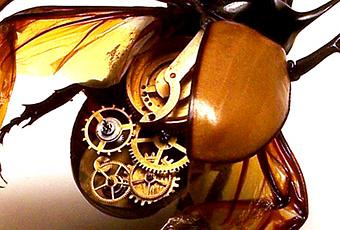 Insect Lab est un projet lancé par Mike Libby, un jeune sculpteur américain un peu fou qui a déjà réalisé de nombreuses expositions aux États Unis et à travers le monde. Un jour, alors qu’il trouve un scarabée mort intact puis une montre ancienne, il a l’idée de rassembler ses deux trouvailles en seul objet, créant une sorte de chimère mécanique. Après quelque temps passé à disséquer le scarabée puis à lui greffer des pièces d’horlogerie, notre apprenti Frankenstein obtient une belle petite sculpture. L’idée d’Insect Lab est née : un laboratoire de création d’insectes mécaniques hybrides, des sortes de robots insectoïdes sortis tout droit d’une science fiction rétrofuturiste. Depuis le sculpteur s’est fait un plaisir d’explorer de façon plus systématique toutes les espèces d’insecte : coccinelles, araignées, papillons, libellules, abeilles, guêpes, criquets, mantes religieuses… Le résultat est une collection digne d’un authentique entomologiste (l’entomologie est la branche de la zoologie dont l’objet est l’étude des insectes), mais d’une entomologie d’un nouveau genre, non pas naturaliste mais « artificialiste » pourrait-on dire. Un beau cabinet de curiosité sur un monde artificiel en somme ! Si vous aimez le design steampunk, ne ratez pas la suite en images.