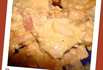 Ingredientes :Escalopines de solomillo de cerdo cortadas en tiras1/2 queso camembert125 g de taquitos de bacon3 cucharadas soperas de nata para cocinarpimientaajo en polvo1 dosis de caldito de pollo10 cl de vino blancoaceite de olivaDorar el solomillo de cerdo en un poco de aceite de oliva.Añadir la dosis de caldo, el vino, el queso camembert cortado en trozos y los taquitos de bacon. Pimentar. Añadir un poco de ajo en polvo.Guisar durante 1 hora 30.Un poco antes de servir, añadir la nata... Calentar sin tapar. Servir bien caliente.