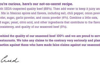 Taco Bell est critiqué car la viande ne comporterait que 36% de boeuf. Mais la marque veut préserver le secret de ses formules (comme tout Fast Food qui se respecte). La plainte est particulière car elle ne comporte aucune demande pécuniaire (ce qui lui donne un coté philanthropique) et se base sur le fait que le “ministère” de l’agriculture américain impose un pourcentage de 40% de viande pour que le terme de ” taco à la viande” soit utilisé (si c’est pas clair, dites le moi)