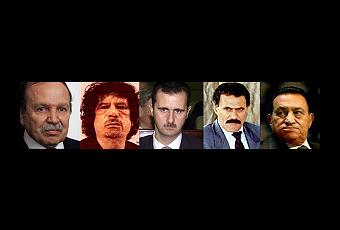 Le plus âgé d’entre eux affiche 82 ans, le plus jeune 46 ans. En Algérie, en Syrie, en Egypte, en Libye ou au Yémen, les présidents sont arrivés au pouvoir soit par des élections truquées soit en renversant l’ancien régime. Tout sauf par des moyens légaux et démocratiques. A l’instar de Ben Ali le tunisien balayé par une révolution populaire après 23 ans de pouvoir, ces cinq dirigeants risquent de voir leurs pouvoirs vaciller tant ils sont devenus extrêmement impopulaires dans leurs pays.Abdelaziz Bouteflika, 73 ans, élu en avril 1999. L’ancien ministre des affaires Etrangères sous Boumediene est revenu aux affaires après vingt ans d’une « traversée du désert » passée entre Genève, Dubaï, Paris et Alger. Adoubé par l’armée, il a été élu en 1999 puis réélu en 2004. Alors que la constitution de son pays limitait l’exercice présidentiel à deux mandats, Bouteflika a imposé une révision de la loi fondamentale en novembre pour supprimer la limitation des mandats. Résultat : il a été réélu en avril 2009 avec le score brejnévien de90, 24 %. Diminué par la maladie, le président compte certainement finir ses jours à la tête de l’Etat.Mohamed Hosni Said Moubarak, 82 ans, élu en octobre 1981. Vice-président de l’Egypte du temps de la présidence d’Anouar Sadate, il succède à celui-ci en 1981 peu de temps après son assassinat par un commando islamistes. Moubarak est réélu régulièrement en 1987, 1993, 1999 et en 2005, toujours avec des scores supérieurs à 80%. Des scores soviétiques. Son désir de voir son fils, fils Gamal, 46 ans, assurer sa succession à la tête de l’Etat s’est fracassé dans les rues du Caire.Mouamar El Khadafi : 69 ans, porté au pouvoir après un coup d’Etat en septembre 1969. Cet ancien capitaine, autoproclamé colonel a pris le pouvoir le 1er septembre 1969, à 27 ans, par un coup d'État contre le roi Idris Ier, alors que celui-ci était en Turquie pour un traitement médical. Depuis, il ne l’a plus jamais lâché. Mégalomane, brouillant, insaisissable, le guide a privatisé son pays pour le transformer en propriété familiale. Moins d’un renversement du régime sa succession devrait revenir à l’un de ses fils, sans doute Seïf el Islam.Ali Abdallah Salah : 69 ans, portés au pouvoir sur les chars en juillet 1978. Cet ancien militaire est devenu président quand Bouteflika était encore ministre des Affaires étrangères sous Boumediene. Ali Salah n’est pas arrivé au pouvoir après un scrutin ouvert et pluraliste, mais porté par les chars des militaires après le coup d’Etat qui s’est soldé par l’assassinat des présidents Ibrahim al-Hamdi et Ahmad al-Ghashmi. Celui qui a soutenu Saddam Hussein lors de la guerre du Golfe (1990-1991) est le premier président élu du pays en 1999 avec 96 % des voix. Sept ans après, il est réélu le 22 septembre 2006 avec 77,2% des suffrages.Chez Al Abdellah, le pouvoir est une affaire de famille. Son fils aîné commande la garde républicaine et les forces spéciales, ses trois neveux s’occupent de la sécurité nationale, des forces centrales de sécurité et de la garde présidentielle. Quand à son demi-frère, il dirige tout simplement l’armée de l’air. La rue yémenite ne veut plus de lui.Bachar Al-Assad : 45 ans, élu à 97,62 % en juillet 2000. Le cadet des présidents et autres dictateurs à vie. Fils cadet de l’ancien président syrien Hafez Al-Assad (1930-2000), Bachar avait à l’origine une faible appétence pour la politique. Son père préparait son frère aîné, Bassel, pour lui succéder. Celui-ci meurt dans un accident de voiture en 1994, et Hafez Al-Assad fait alors appel à son fils cadet, Bachar, qui venait juste d’obtenir son diplôme de spécialiste en ophtalmologie à Londres.Il rentre alors à l’académie militaire Homs et devient colonel en 1999. À la mort du président Hafez Al-Assad, le parlement syrien amende la constitution pour abaisser l'âge minimum du candidat à la présidentielle de 40 à 34 ans. Du sur mesure pour Bachar qui est promu deux jours plus tard général en chef des forces armées syriennes et le parlement le propose comme président de la République syrienne le 25 juin 2000. Il est reconduit à la présidence de la République après sa victoire avec 97,62% des voix exprimées lors d'un référendum présidentiel organisé le 27 mai 2007. A moins d’un coup d’Etat, d’un accident, d’une mort naturelle, il devrait finir ses jours comme président de la Syrie.