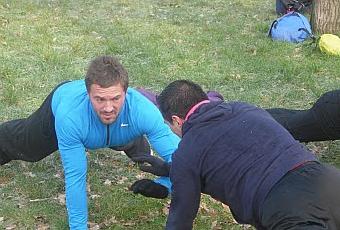 Gainage actif Château de Vincennes, 10h30, la température est un peu remontée, il fait -3°C contre -5°C au petit matin, une bise de nord-est souffle à 20 km/h, les lacs du bois de Vincennes sont gelés, les clairières sont toutes blanches. Croyez-vous que cela aurait amoindri la motivation des bootcampeurs parisiens ? Que nenni, tous sont là ! Un petit footing d'une dizaine de minutes avant d'attaquer le premier atelier : un échauffement général (épaules, jambes, pectoraux, abdos,...) puis quelques montées à une jambe sur les bancs qui entourent le lac de Saint-Mandé.