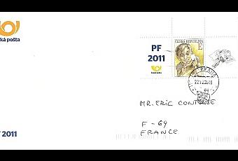 Ce timbre a été émis en feuille de 9 timbres + 12 vignettes personnalisables. Seule la vignette en haut à droite de la feuille est pré-imprimée, représentant une loupe et des timbres. C'est cette vignette qui figure à droite du timbre ci-dessus :-)La poste tchèque a logiquement personnalisé l'autre vignette attenante avec son propre logo et ce mystérieux "PF 2011", également mentionnée sur l'enveloppe.