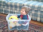 Un jeu pour le petit enfant qui ne sait pas encore parfaitement rampé et qui n'est pas toujours stable quand il est assis.On l'assoie dans une boîte solide. Les côtés rigides l'empêchent de basculer.