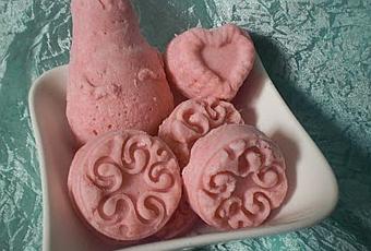 Voici une recette de Laurence de MaCosmetoPerso dans son intégralitéICIJ en ai gardé la base et fais des ajouts Ingrédients :96 grammes de bicarbonate de soude24 grammes de SLSA33 grammes de beurre de karité moi du Burkina Faso offert par Nathalie merci !Mes ajouts:2 grammes de fragrance smoothie fraisepoudre de fraise pour coloréMoules coeur et tourbillon ICI