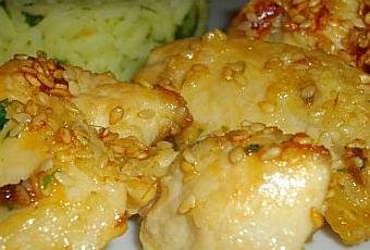 Hacher finement le gingembre, émincer les filets de poulet et les couvrir d'huile de sésame et de graines de sésame.