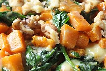 Coupez le butternut en petits cubes (pour l'éplucher je vous conseille d'utiliser un économe fait pour les tomates ou poivrons dentelé) . Faites le revenir dans une sauteuse avec une cuil à soupe d'huile d'olive à feu doux pour qu'ils soit tendre . Faites cuire les pâtes dans un grand volume d'eau bouillante salée . Egouttez les et gardez les au chaud . Ajoutez dans la sauteuse les pousses d'épinard pour les cuire . Réservez .Réchauffez la sauteuse avec les légumes à feu doux et ajoutez le roquefort en morceaux , remuez délicatement pour que le fromage commence de fondre . Dans les assiettes disposez les pâtes chaudes , et déposez dessus 2/3 cuillères à soupe de légumes au roquefort . Décorez avec des noix concassées .
